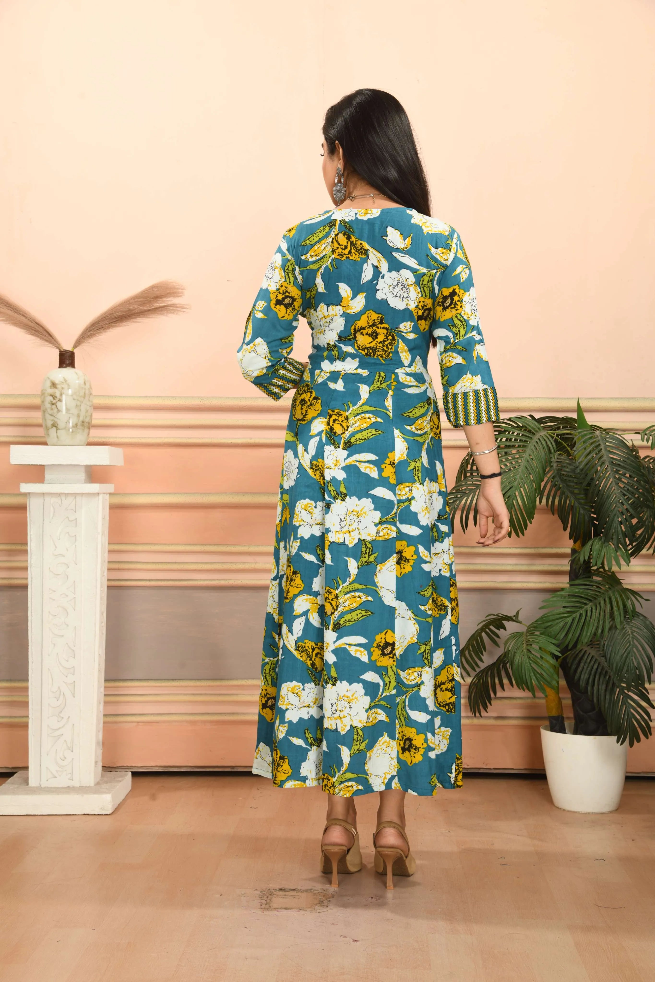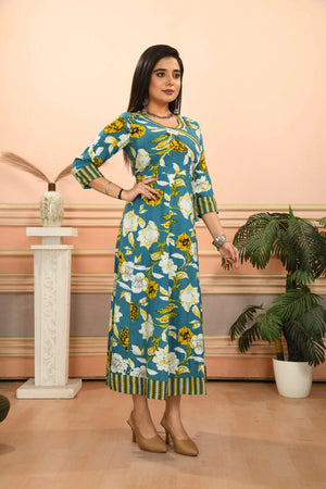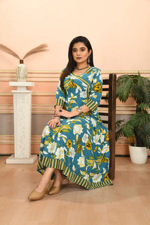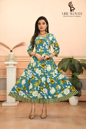 Make a stunning style statement with this beautiful Anarkali kurta from Vibe Woven. The ankle-length silhouette features a captivating teal blue base adorned with an elegant floral print in yellow and white. Crafted from comfortable cotton fabric, this traditional Indian kurta showcases intricate design elements including a stylish V-neckline embellished with decorative trim, three-quarter length sleeves with patterned cuffs, and a coordinating striped border at the hem. The angrakha-style wrap detail adds a classic touch, while the flared cut creates graceful movement. Perfect for festive occasions or special events, this versatile kurta can be paired with churidars, leggings, or palazzo pants to create different looks. The thoughtful design combines traditional aesthetics with contemporary comfort, making it an excellent addition to your ethnic wear collection.