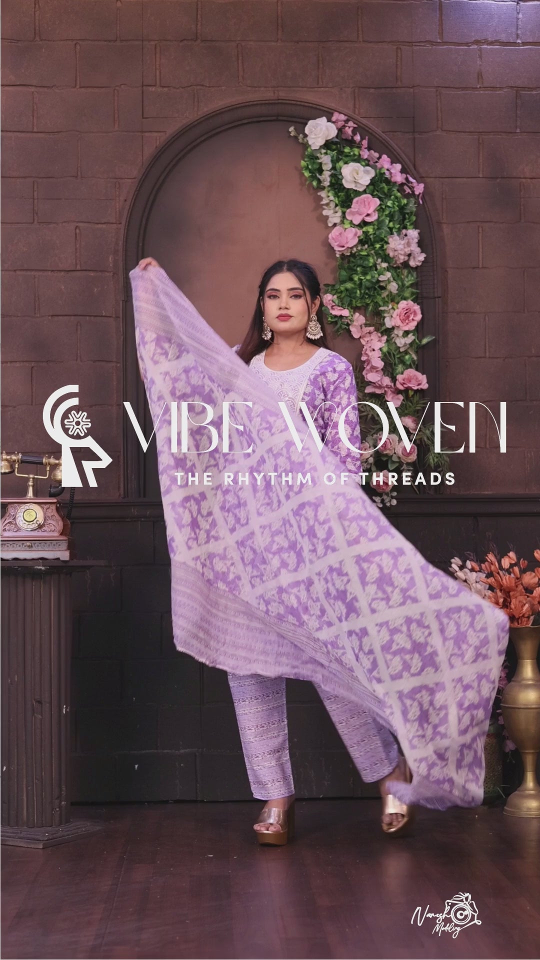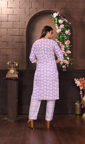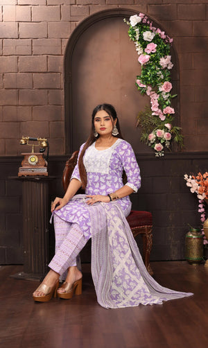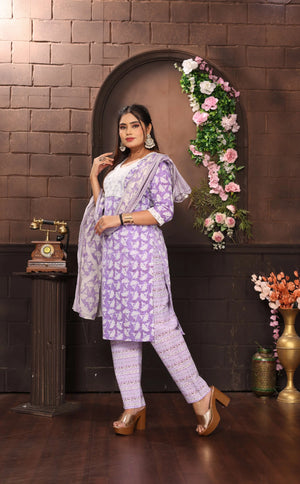 Embrace elegance with this stunning Vibe Woven lavender cotton salwar suit set. The ensemble features a beautifully crafted kurta adorned with delicate white prints and an eye-catching white yoke design. The three-quarter sleeves and round neckline add a contemporary touch while maintaining traditional charm. The matching pants showcase intricate patterns in coordinating lavender tones, offering both style and comfort. The outfit is perfectly complemented by a graceful dupatta with sophisticated print work and border details that enhance the overall aesthetic. This versatile set is ideal for festivals, celebrations, or special occasions. The cotton fabric ensures comfort throughout wear, while the carefully crafted details reflect superior craftsmanship. The subtle yet striking colour palette makes it suitable for various occasions, from family gatherings to formal events. The set combines traditional Indian ethnic wear elements with modern styling, creating a perfect balance of classic and contemporary fashion.