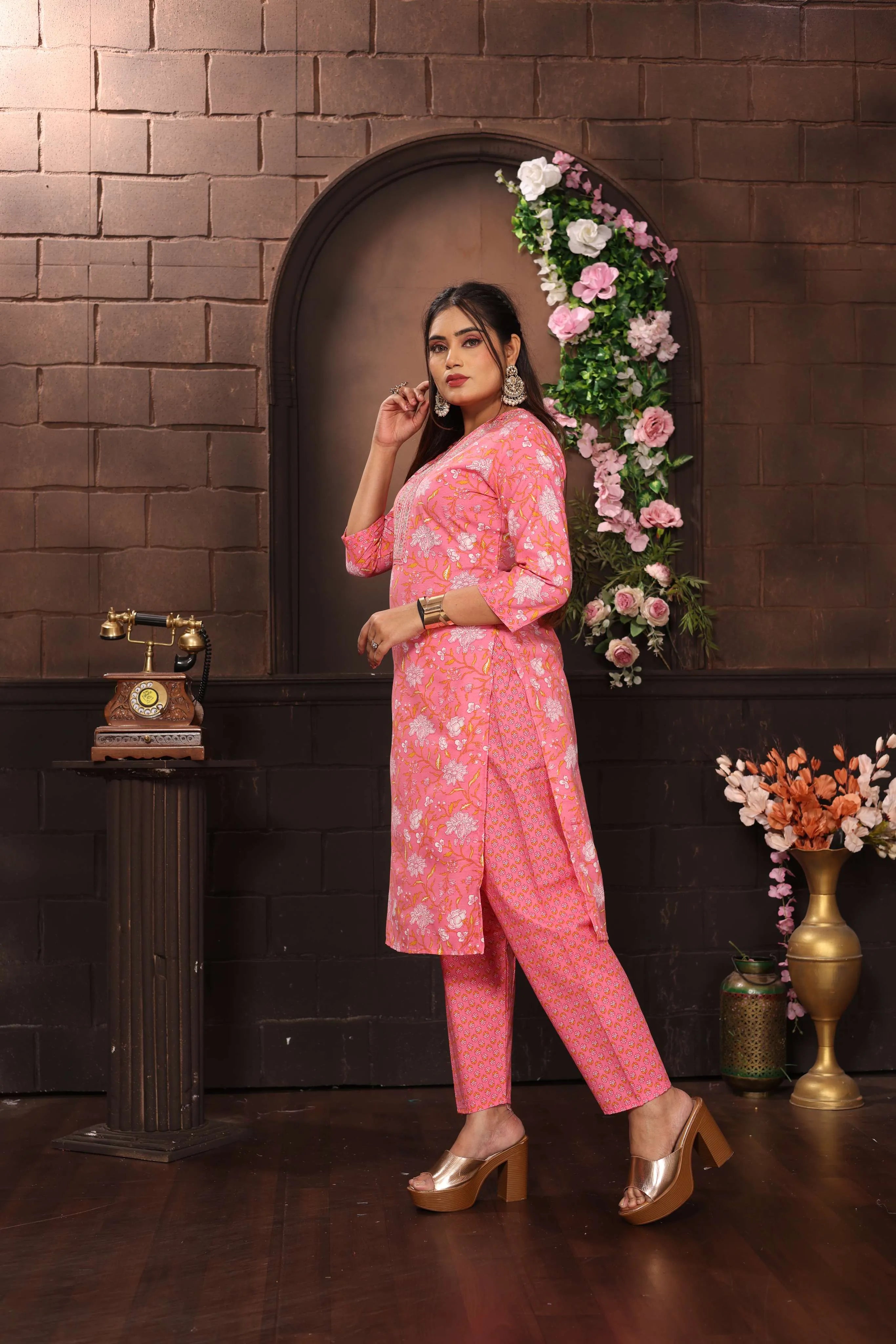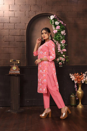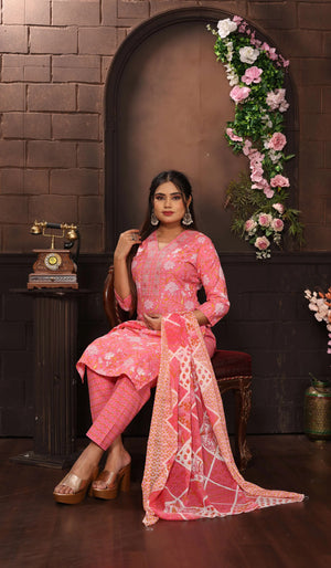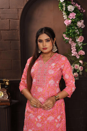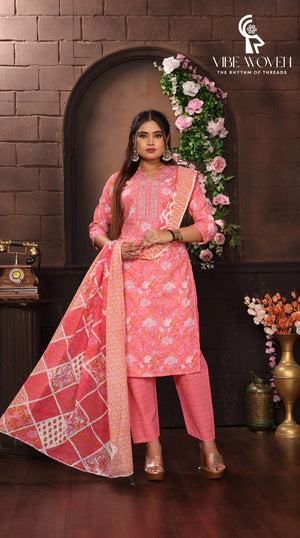 Elevate your ethnic wardrobe with this stunning three-piece Salwar Kameez suit set in a captivating pink hue. The cotton ensemble features an exquisite floral print throughout the kameez (top), complemented by intricate embroidery work on the yoke. The comfortable straight-cut pants perfectly balance the graceful silhouette, while the matching printed dupatta adds an extra layer of elegance with its geometric patterns and traditional motifs. The three-quarter sleeves and V-neckline of the kameez offer both style and comfort, making it suitable for various occasions. The suit set showcases fine craftsmanship in its detailed prints and coordinated colour scheme, embodying the essence of traditional Indian fashion. Perfect for festivals, celebrations, or special occasions, this ensemble combines classic design elements with contemporary comfort. The cotton fabric ensures breathability and ease of movement, making it suitable for all-day wear. Hand wash recommended to maintain the vibrancy of the prints and quality of the fabric.