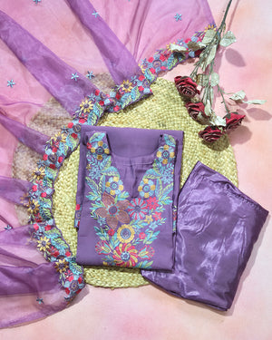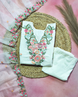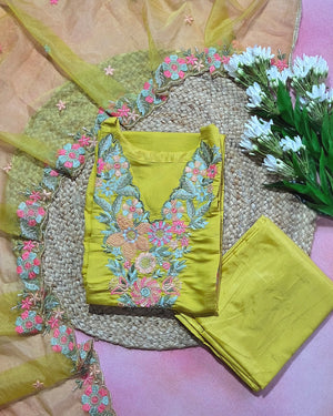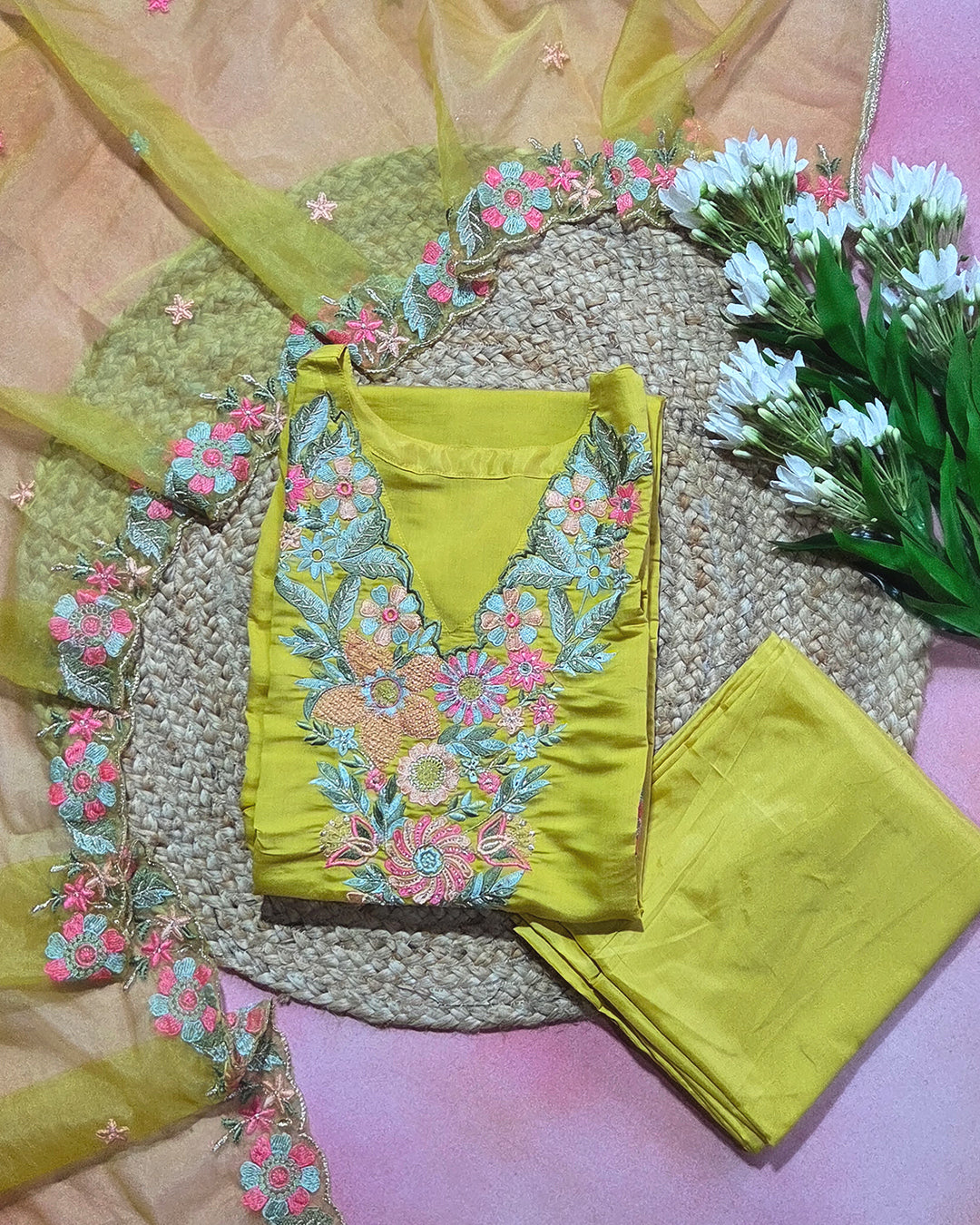 Discover the beauty of Muslin Silk, designed to fit every body — from S to 4XL. Paired with delicate Organza Dupattas and graceful embroidered N-neck & V-neck designs, each piece is made to celebrate you.