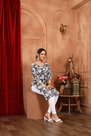Affordable doesn't mean ordinary. This Rose Grey short kurti features soft abstract patterns that blend with any bottom wear. Tailored for comfort and versatility, it’s a perfect go-to for college, shopping, or casual meet-ups.