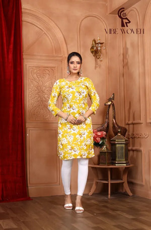 The RoseGold kurti features a vibrant yellow shade enhanced with joyful floral accents, designed to brighten your day. Expertly crafted for comfort and style, it offers a breathable fit ideal for summer wear, whether running errands or relaxing at home. This kurti blends cheerful aesthetics with practical comfort, making it a versatile addition to your wardrobe.