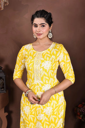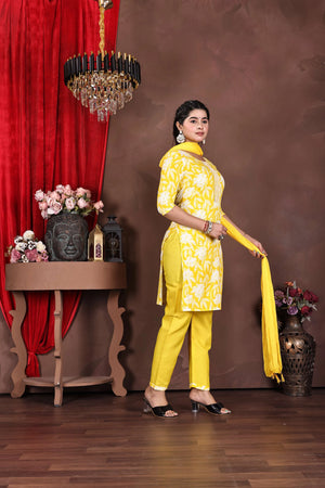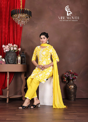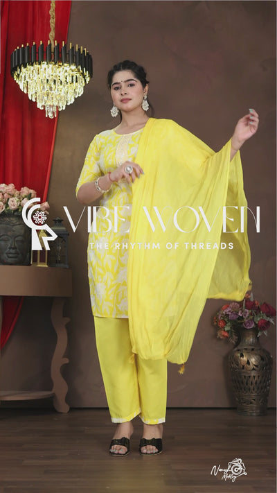 Introducing the Vibe Woven Suryaraag Cotton Salwar Suit Set, a stunning three-piece ensemble that radiates warmth and elegance. This traditional ethnic wear features a vibrant yellow kurta adorned with graceful white floral prints and delicate leaf motifs, complemented by a matching yellow salwar and dupatta. The kurta's design is enhanced with intricate lace detailing down the centre, adding a touch of sophistication. Crafted from premium cotton fabric, this outfit ensures comfort and breathability, making it perfect for summer wear and festive occasions. The three-quarter sleeves and round neckline offer a contemporary touch to this classic silhouette. The ensemble's cheerful yellow hue makes it particularly suitable for celebratory events and traditional ceremonies. The comfortable fit and elegant styling make it versatile enough for both casual wear and special occasions. The matching dupatta completes the look with grace and traditional charm. This salwar suit set exemplifies the perfect blend of comfort, style, and traditional Indian aesthetics.