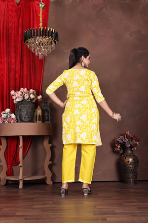 Vibe Woven Suryaraag Cotton Salwar Suit Set, Yellow with White Floral Print, Traditional 3-Piece Ethnic Wear for Women